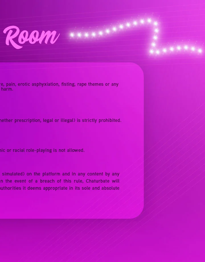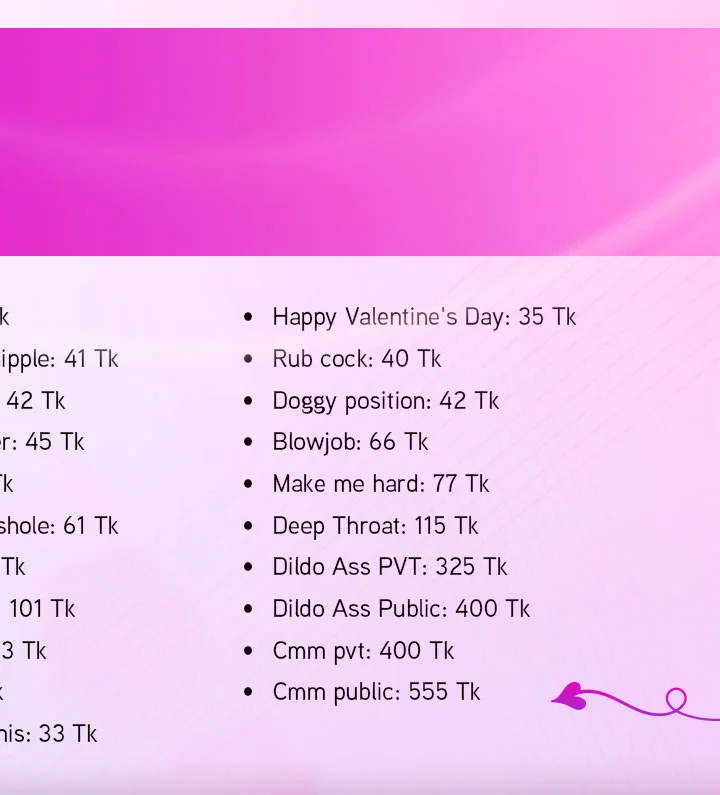 Pseća poza, Ocjenjivanje kurca, Prljavi razgovor, Erotski ples, Masturbacija, Spanking, Ahegao, Pušenje, Drkanje, SPH, Show s uljem, Twerk, Analno, CEI (upute za gutanje sperme), Prskanje, Prstenjanje, Striptiz, Ejakulacija, Duboko grlo, Lizanje stopala, Dildo ili vibrator, Pušenje, Pokazivanje, Rupa slave, Fetiš stopala, Ponižavanje